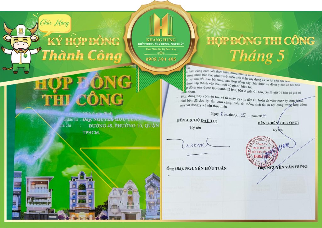 Khang Hưng đã ký kết thành công hợp đồng thi công công trình nhà phố Tân Cổ Điển tại Quận 6. Chúng tôi trân quý sự tin tưởng của Quý Khách Hàng khi đồng hành và gửi trao ngôi nhà đến Khang Hưng Construction